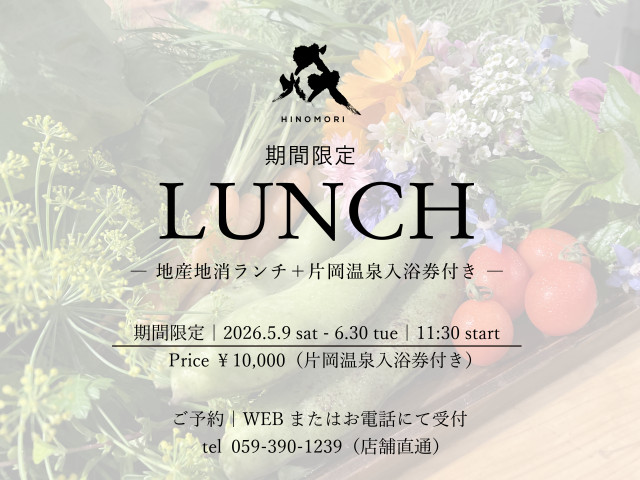 HINOMORI 日帰りランチプラン(片岡温泉入浴券付き)